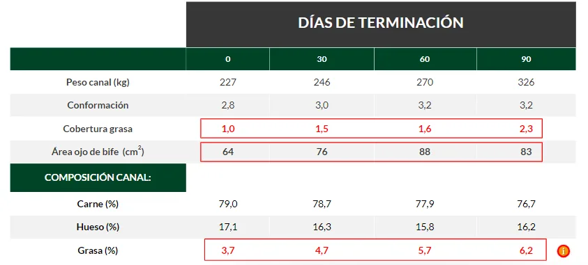 A medida que aumenta el periodo de terminación mejora la conformación carnicera del animal, reflejada en este ejemplo a través de un aumento del área de ojo de bife o área del músculo Longissimus dorsi como así también, y por sobre todo, de un aumento de la deposición de tejido adiposo subcutáneo. Nuevamente puede apreciarse que el tejido que más variaciones presenta, ante cambios nutricionales, es el tejido adiposo tanto en el animal vivo como en su media canal.