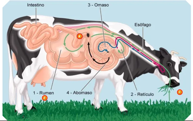 Debido a la fermentación ruminal el vacuno adulto eructa hasta 600 litros de gas/día compuesto por 65% de dióxido de carbono (CO2), 27% de metano (CH4), 7% de nitrógeno (N2), 0,6% de oxígeno (O2), 0,2% de hidrógeno (H2) y 0,01% de sulfuro de hidrógeno (H2S).