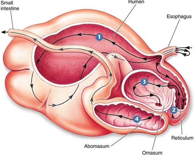 La función de los tres primeros compartimentos es la de almacenar y retardar el pasaje del alimento ingerido, ya que aquí se lleva a cabo la fermentación anaeróbica del material vegetal y la absorción de algunos nutrientes.