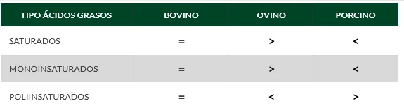 De todos modos, debemos aclarar que la composición de ácidos grasos del vacuno se acerca más a la del ovino que a la del porcino, por ser los dos primeros especies rumiantes y este último un monogástrico.