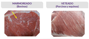 - En cerdos y equinos, la grasa aparece en vetas, por lo que se denomina veteado.