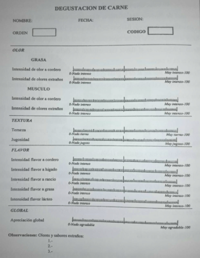 Durante el análisis, los panelistas reciben porciones codificadas de carne y completan planillas diseñadas para evaluar atributos específicos como: