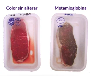 En la foto izquierda se observa un trozo de carne al que se adicionaron antioxidantes naturales. Podemos comprobar cómo estos antioxidantes retrasaron la oxidación de los ácidos grasos así como también del hierro de la mioglobina. A la derecha se presenta una pieza de carne sin agregado de antioxidantes donde la formación de metamioglobina es elevada causando un rechazo del consumidor en el momento de la compra.