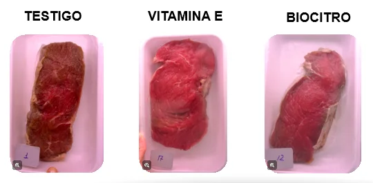 En esta imagen podemos ver tres piezas de carne, dos de las cuales fueron tratadas con antioxidantes y una permaneció como testigo sin el agregado de ningún aditivo (izquierda). En la foto central se observa la carne a la que se adicionó vitamina E como antioxidante para prevenir la oxidación del hierro de la mioglobina y de los ácidos grasos. A la derecha se agregó un antioxidante comercial denominado Biocitro, compuesto por extracto de cítricos sobre soporte inerte. En la actualidad hay varios productos comerciales basados en extractos de cítricos con antioxidantes de origen natural que mejoran la eficacia nutricional y el equilibrio digestivo para una estrategia de producción sin antibióticos, lo cual se va a convertir en pocos años en una exigencia mundial en todos los alimentos frescos de origen animal.