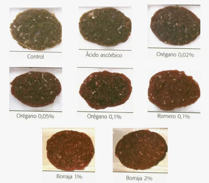La industria está trabajando en los últimos años en el empleo de aditivos naturales para reemplazarlos por los artificiales. Hay una gran presión a nivel mundial en este aspecto. Muchos de los antioxidantes que se han estudiado, y ya se han incorporado en varios alimentos entre ellos la carne, pertenecen a plantas aromáticas como el orégano, romero, menta, lavanda, tomillo, etc. En el caso de este estudio se evaluó la incorporación de antioxidantes naturales en hamburguesas comerciales. Se utilizaron extractos de orégano, romero y borraja (verdura muy cultivada en Europa) a diferentes concentraciones. Puede verse, comparada con la fotografía superior izquierda que representa el producto sin agregado de antioxidantes, cómo el color mejora a medida que se incrementan las concentraciones de estos extractos en particular el de la borraja.