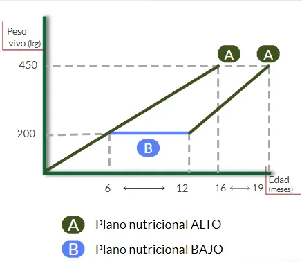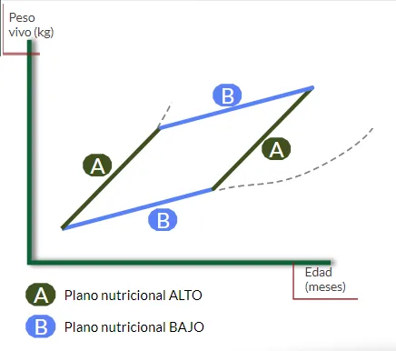 Lo ideal es que el animal no tenga nunca en su vida un periodo de escasez alimenticia/nutricional. Esto puede verse en la recta de la izquierda simbolizada con la letra “A”. Es decir, si el vacuno recibió siempre un alto plano nutricional (A) su velocidad de crecimiento será elevada y, en el caso de este ejemplo, llegará a faena a los 16 meses de vida con un peso vivo de 450 kg. Si este mismo animal tuvo un periodo de restricción entre los 6 y 12 meses de vida (un bajo plano nutricional simbolizado como “B”) y después de los 12 meses de edad vuelve a recibir un alto plano nutricional (A), se acelerará su velocidad de crecimiento teniendo una ganancia de peso vivo más que proporcional comparada con aquellos individuos que no tuvieron una restricción, llegando al mismo peso de faena (450 kg) pero con 19 meses de vida. Esto significa que su velocidad de crecimiento fue más acelerada y, a pesar de la restricción de 6 meses, solo “demoró” 3 meses más en llegar a faena.