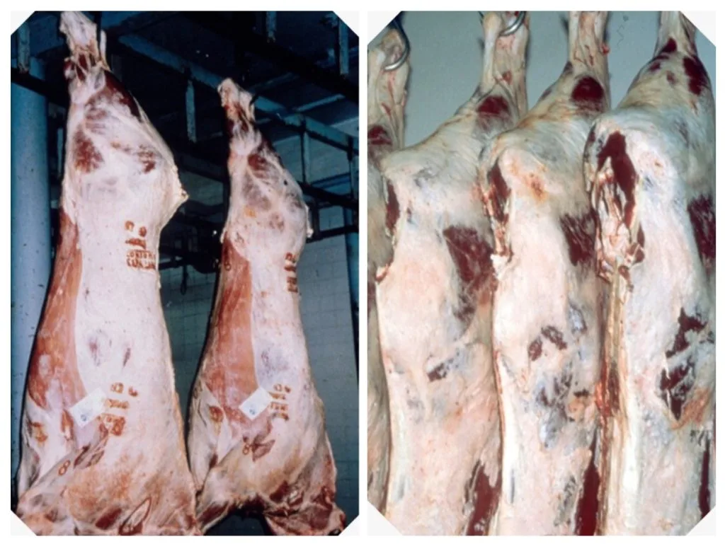 En estas fotografías podemos observar lo expresado respecto al crecimiento compensatorio. En la foto de la izquierda pueden verse medias canales de animales que tuvieron una buena deposición de músculo (perfiles convexos en masas musculares del cuarto trasero) y, si sufrieron un periodo de restricción, este se produjo al finalizar su vida afectando levemente la deposición de grasa. Mientras que en la foto de la derecha pueden observarse medias canales de animales que tuvieron una restricción durante las primeras etapas de su vida lo que afectó la deposición de músculo (nótense los perfiles cóncavos de las masas musculares de la pierna) y, posteriormente, recibieron un alto plano nutricional que provocó una excesiva deposición de grasa afectando su valor comercial.
