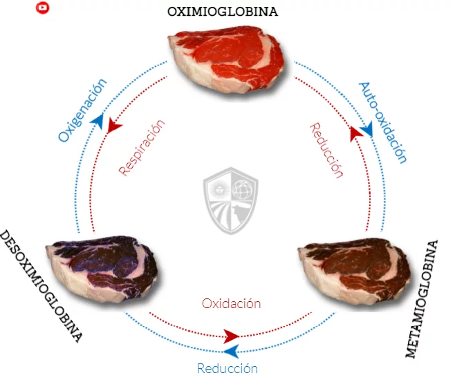 Luego de unas pocas horas de contacto con el aire la mioglobina se oxigenará denominándose OXIMIOGLOBINA. En este estado químico presenta un color rojo brillante intenso característico de la carne fresca en buen estado. Si dicha carne es sobreexpuesta al oxígeno, como suele suceder cuando esta exhibida en una góndola durante varios días, debido a esa sobreoxgenación el hierro que contiene se oxida pasando la mioglobina a un estado químico denominado METAMIOGLOBINA. Esta mioglobina oxidada presenta un color rojo amarronado.