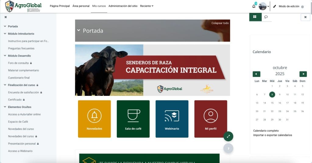 La plataforma, diseñada bajo la estética institucional de la empresa, permite que los colaboradores accedan a contenidos específicos, participen en encuentros sincrónicos y gestionen su propio avance dentro de los cursos.