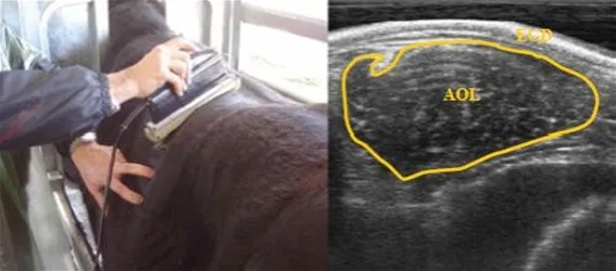 Medición de la grasa subcutánea a nivel de la nalga. Se utiliza en feedlot para medir velocidad de engrasamiento y terminación.