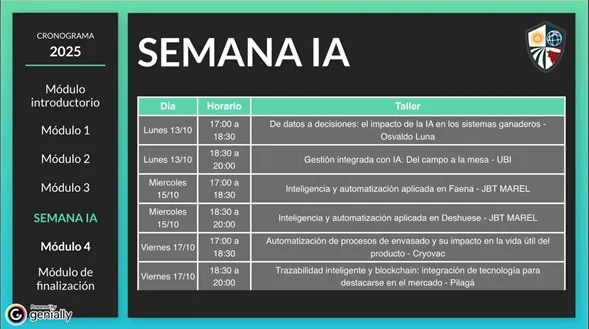 Durante esta semana intensiva, que se integrará entre el módulo 3 y el 4 del cursado, se abordarán casos reales, herramientas aplicadas y tecnologías emergentes de la mano de referentes del sector y empresas líderes en innovación tecnológica para la industria cárnica.