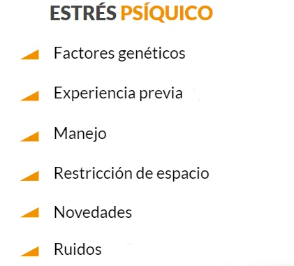 - Factores genéticos: El ESTRÉS PSÍQUICO está relacionado, por ejemplo, con factores puramente genéticos. Es conocido que hay razas más susceptibles de sufrir estrés que otras, como sucede en otras especies domésticas como los cerdos de gran musculosidad (Pietrain, Landrace Belga, etc.). Las razas bovinas tienen diferente temperamento, así como también las diferentes categorías dentro de una raza. Las más temperamentales suelen ser las cebuínas comparadas con las británicas y continentales. Ese temperamento más fuerte las hace más susceptibles de sufrir consecuencias negativas cuando estén bajo condiciones de estrés.