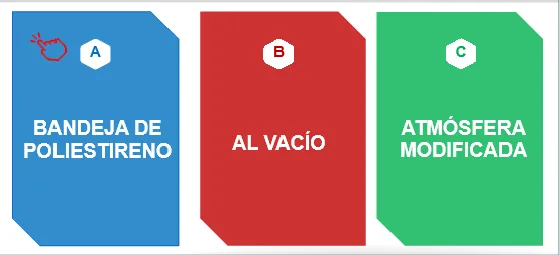 Existen tres tipos diferentes de empaques, cada uno con sus características especiales, ventajas y desventajas. Estos tipos de envasado comprenden al más conocido por todos nosotros como lo es el tradicional trozo de carne colocado en una bandeja de poliestireno expandido y envuelto en resinite (el cual se coloca solamente por cuestiones de preservar la calidad higiénica durante la manipulación), luego la carne envasada al vacío y, por último y más conocida en los países desarrollados, la carne envasada en atmósfera modificada.