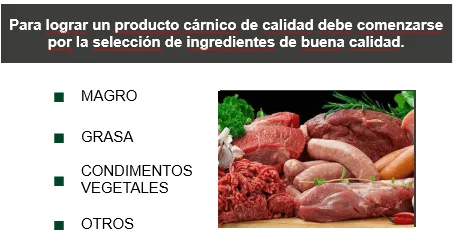 - Calidad tecnológica (pH): PSE/DFD: Se debe controlar el pH de la carne y el correcto proceso de descenso del mismo. Debe evitarse el uso de carnes con defecto de maduración como el PSE (carnes pálidas, blandas y exudativas), el DFD (carnes oscuras, firmes y secas) y aquellas que han sufrido acortamiento por frío.