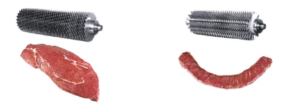 Cuando la carne se encuentra poco pulida o con mucho tejido conjuntivo, una manera de mejorar la terneza, ya sean en piezas enteras o en productos fileteados, es realizar un tratamiento físico que produzca una desestructuración interna, sin perder la forma original del producto. Este tipo de productos los abordaremos tanto en la elaboración de productos empanados (milanesas), como en productos cocidos (jamón cocido), donde es fundamental este tipo de proceso. Existen equipamientos de corte manuales de rodillos o de disco, más utilizados en filetes de carne, o de sable utilizado en cortes cárnicos, donde se debe atravesar toda la matriz cárnica.