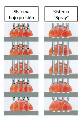 A) Spray: permite una distribución rápida de la salmuera, permite una correcta atomización en toda la masa cárnica, siendo el método generalmente más recomendado.